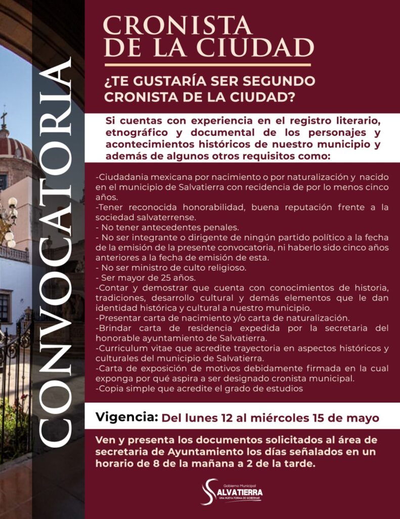 El nuevo cronista deberá contar con experiencia en el registro literario, etnográfico y documental de personajes y acontecimientos históricos, cívicos, sociales, políticos y culturales relevantes del municipio. También será responsable de rescatar, estudiar y difundir las costumbres y tradiciones que forman parte de la identidad salvaterrense.