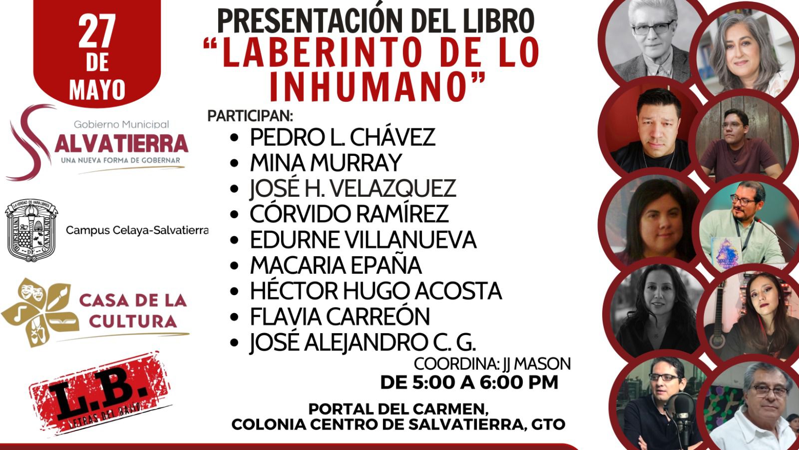 Durante el primer día se presentará el libro “Laberinto de lo inhumano” con la participación de los escritores Pedro L. Chávez, Mina Murray, José H. Velázquez, Corvidio Ramírez, Macaria España, Edurne Villanueva, Héctor Hugo Acosta, Flavia Carreón y José Alejandro C.G.
