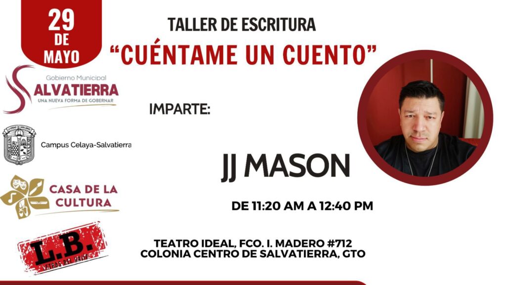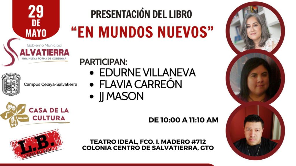Para cerrar la jornada, el jueves 29 de mayo en el Teatro Ideal, de 10:00 a.m. a 11:00 a.m., se presentará el libro “En mundos nuevos”, con la participación de Edurne Villanueva, Flavia Carreón y JJ Manson. Finalmente, se ofrecerá el taller de escritura “Cuéntame un cuento”, impartido por JJ Manson.