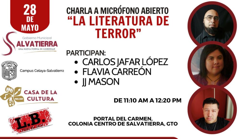El miércoles 28, en el Portal del Carmen, de 11:00 a.m. a 12:00 p.m., se desarrollará la charla con micrófono abierto “La literatura de terror”, con la participación de Carlos Jafar López, Flavia Carreón y JJ Manson. Posteriormente, se presentará la novela “No me olvides”, de Edurne Villanueva, la mesa redonda “¿De dónde viene la poesía?”, con Montserrat Campos e Iván Montenegro bajo la coordinación de José Herlindo Velázquez, así como el libro “Memorias del Fénix”, también de Velázquez.