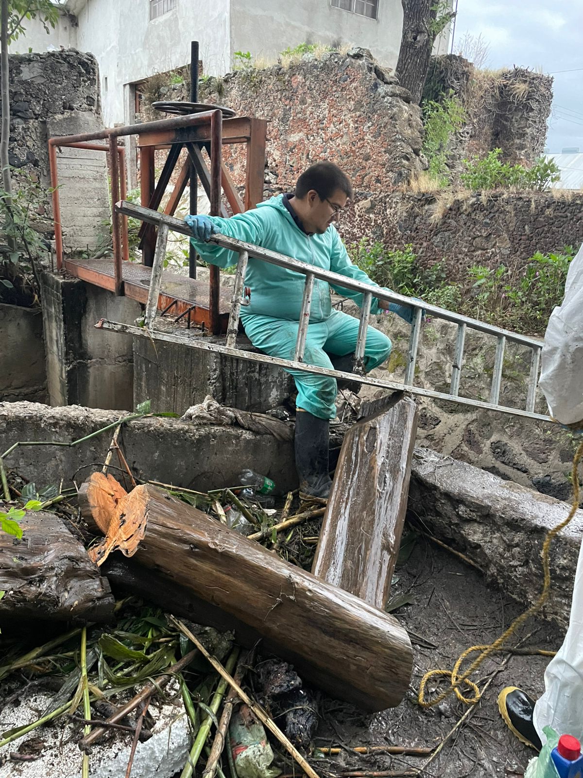 Una vez que el nivel del cauce descendió, elementos de Protección Civil, en conjunto con personal de Servicios Municipales, procedieron al corte del árbol y retiro de basura acumulada que también afectaba la continuidad del flujo en los canales Ardillas y Gugorrones.