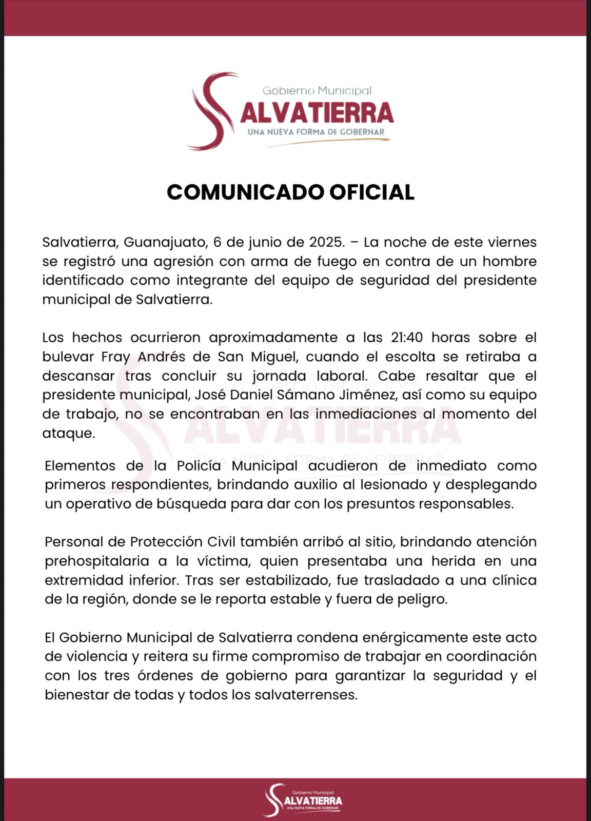 El Gobierno Municipal de Salvatierra condena enérgicamente este acto de violencia y reitera su firme compromiso de trabajar en coordinación con los tres órdenes de gobierno para garantizar la seguridad y el bienestar de todas y todos los salvaterrenses.