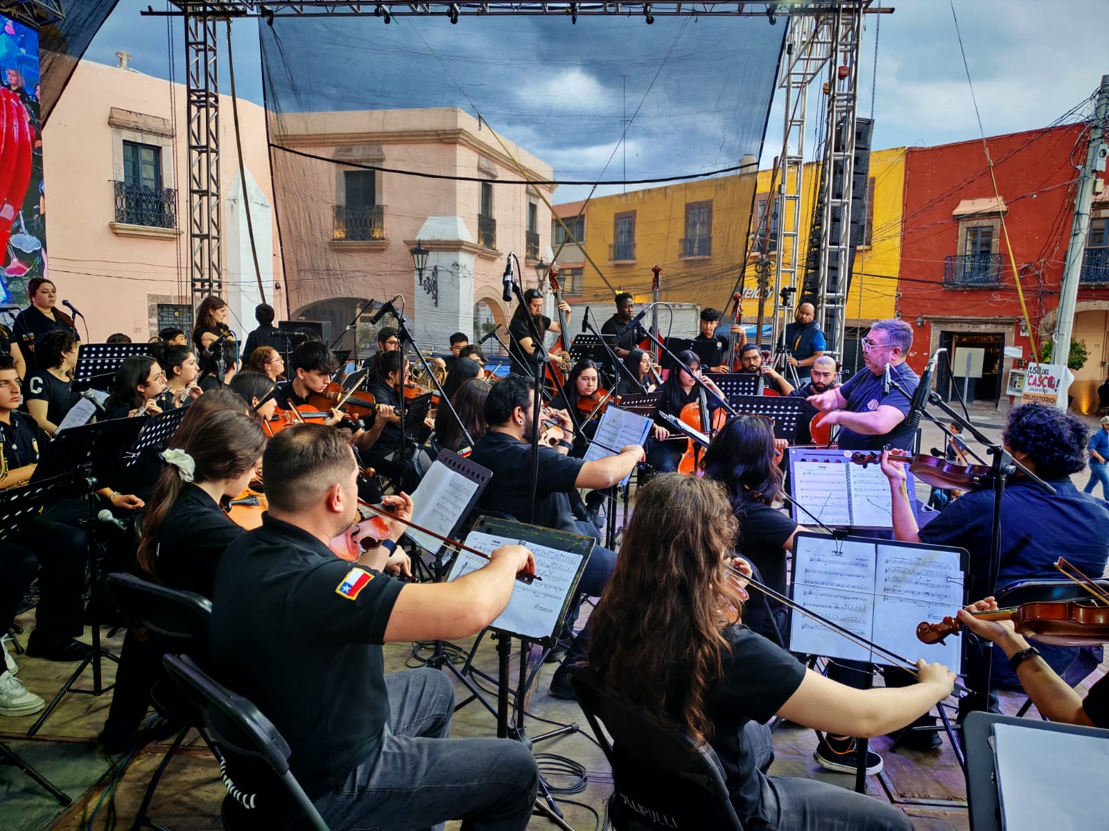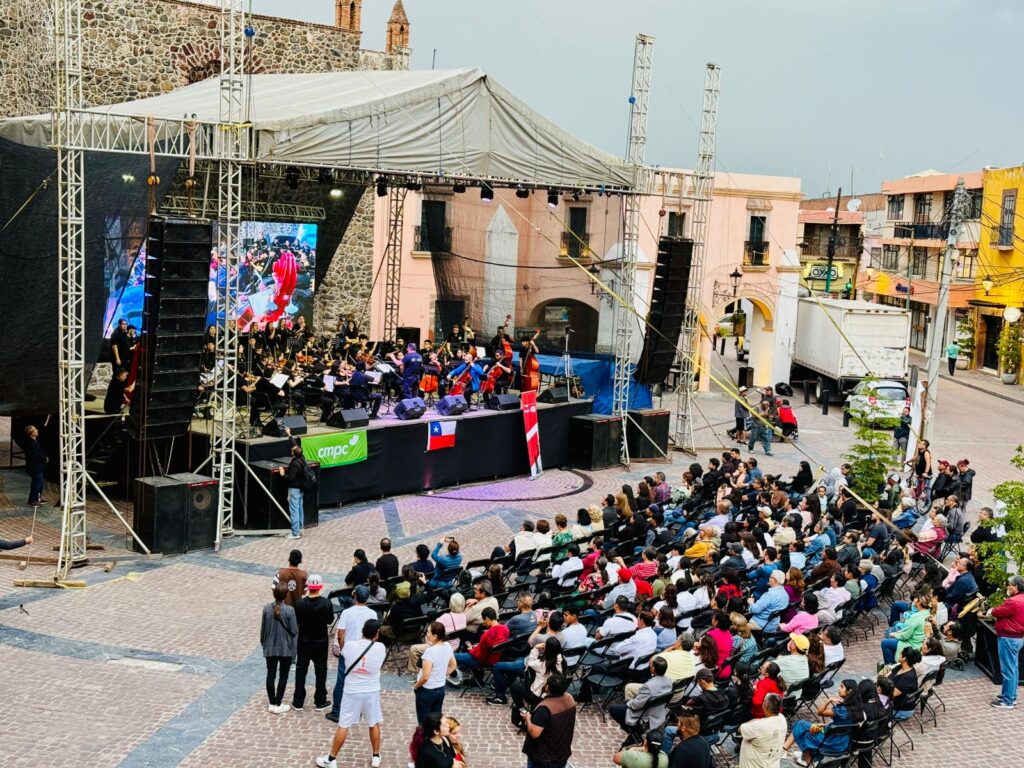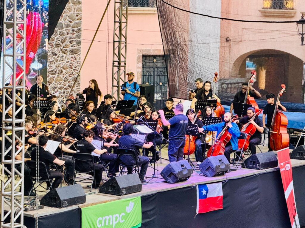 Durante el concierto, la orquesta interpretó la emblemática “Cantata Santa María de Iquique”, obra que narra un episodio histórico de lucha obrera en el norte de Chile durante la época de las salitreras. Además, la agrupación deleitó al público con una serie de interpretaciones que rindieron homenaje a Juan Gabriel y a la música regional mexicana, lo que provocó ovaciones del público.