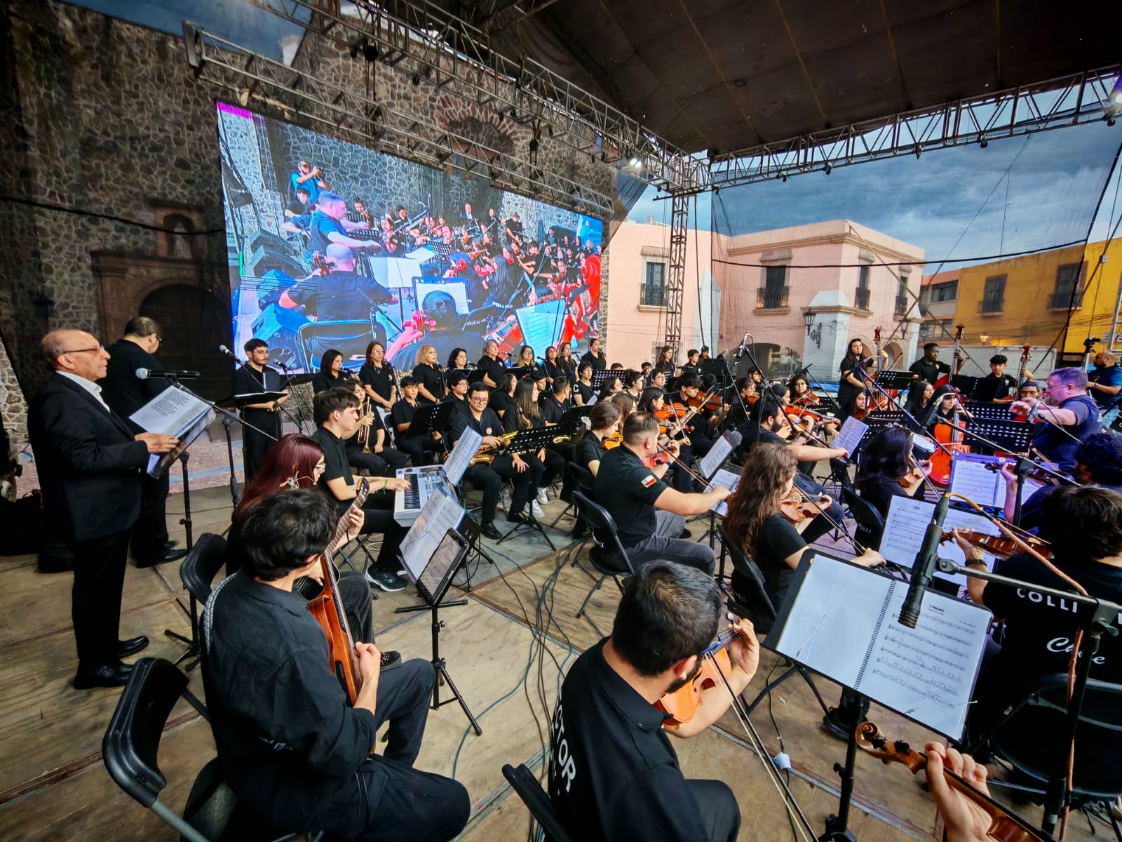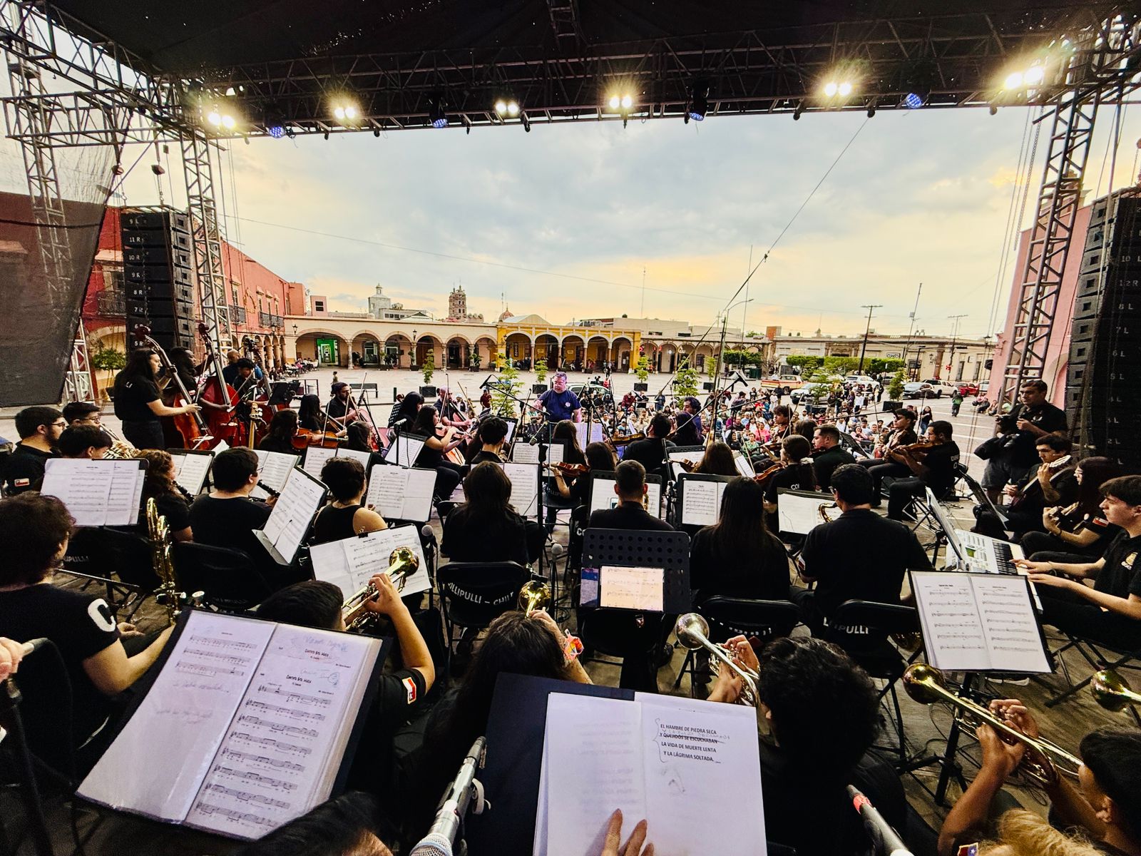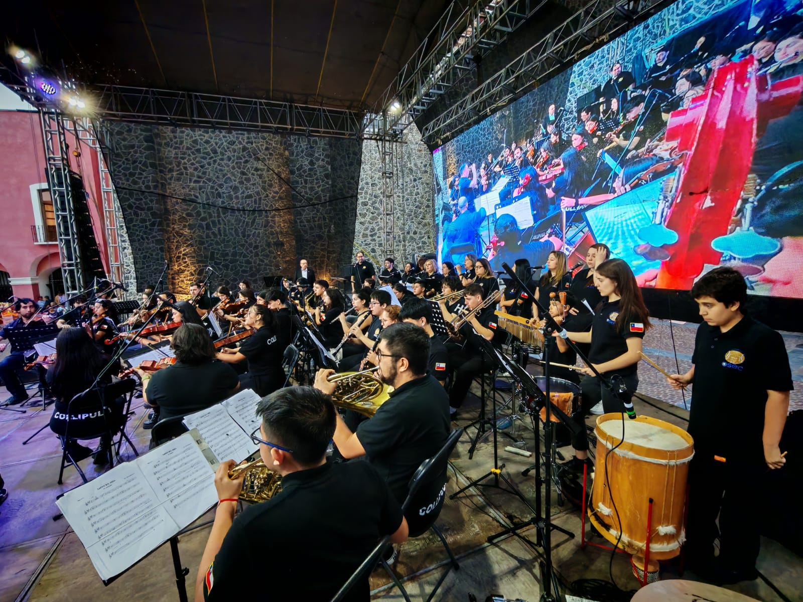 Durante el concierto, la orquesta interpretó la emblemática “Cantata Santa María de Iquique”, obra que narra un episodio histórico de lucha obrera en el norte de Chile durante la época de las salitreras. Además, la agrupación deleitó al público con una serie de interpretaciones que rindieron homenaje a Juan Gabriel y a la música regional mexicana, lo que provocó ovaciones del público.