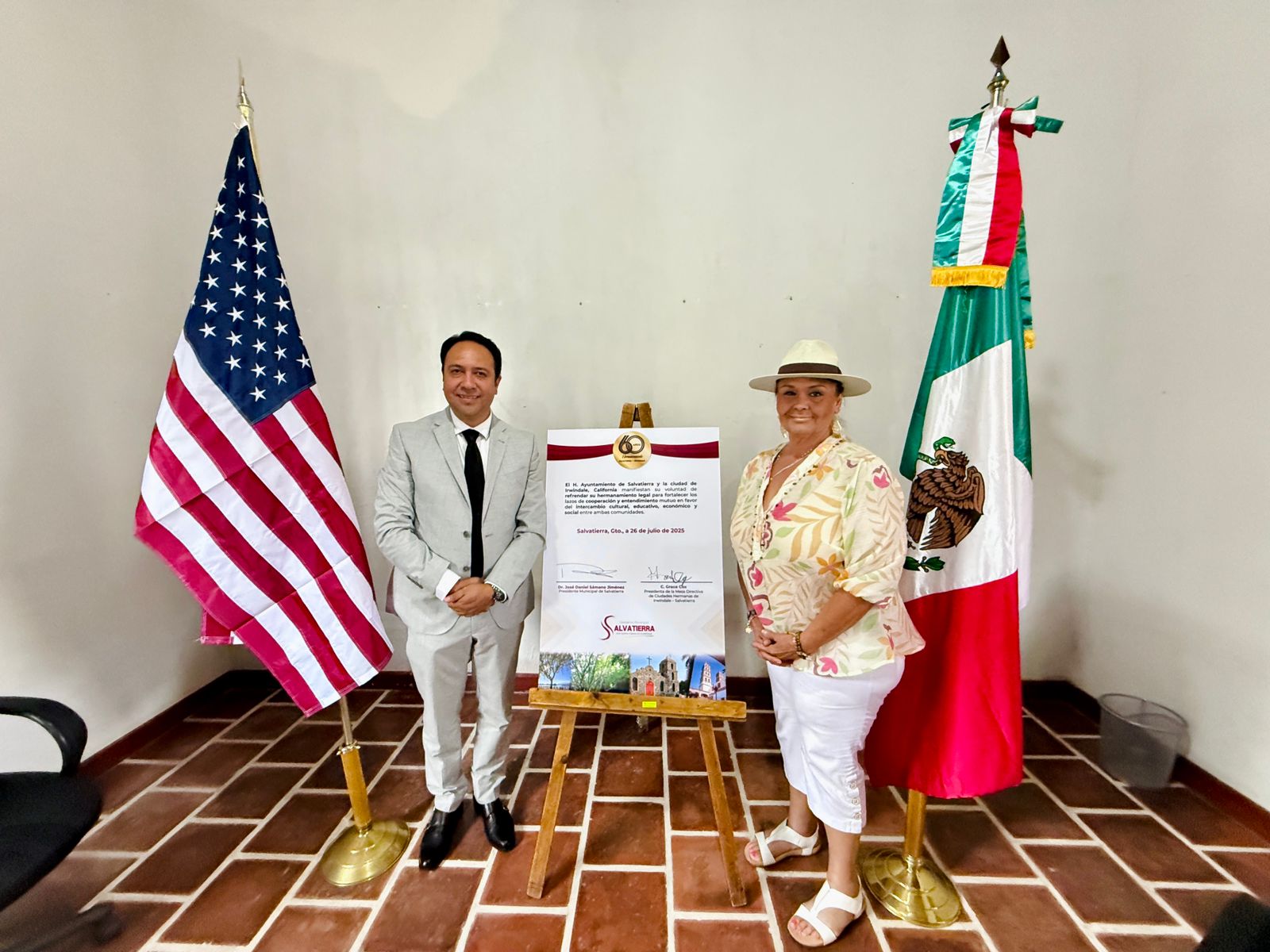 En la ceremonia, el presidente municipal, José Daniel Sámano Jiménez, firmó junto con la presidenta del Comité de Ciudades Hermanas de Irwindale – Salvatierra, Grace Cox, el documento que reafirma la voluntad de las partes de sostener los lazos de amistad e intercambio.