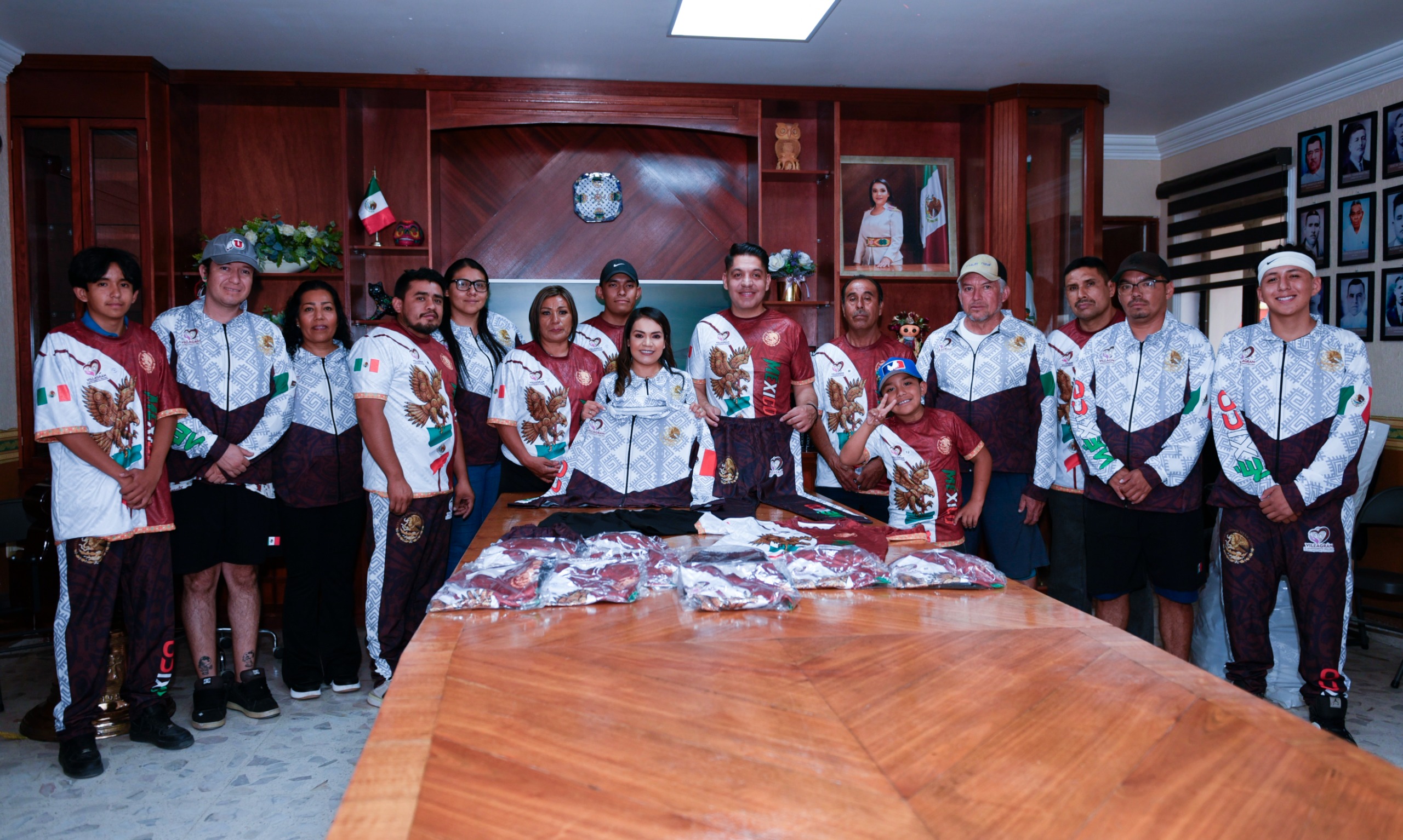 La presidenta municipal Cinthia Teniente Mendoza, junto a el senador Emmanuel Reyes Carmona, realizó la entrega de uniformes oficiales a los deportistas que representarán a Villagrán en el traslado del Fuego Simbólico desde Dolores Hidalgo.