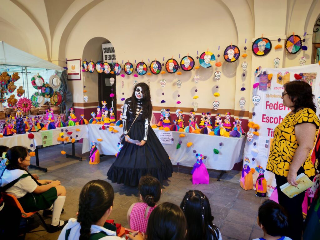 El entremés cultural estuvo a cargo de la bachiller Isis Estephany Domínguez Blas, quien, personificada como catrina, ofreció una interpretación en náhuatl de la canción “La Llorona” y compartió la lectura del cuento corto “La calavera cantante”, obra escrita por su madre, Mariana Blas Sotelo, en un gesto que unió generaciones a través de la palabra y la memoria.