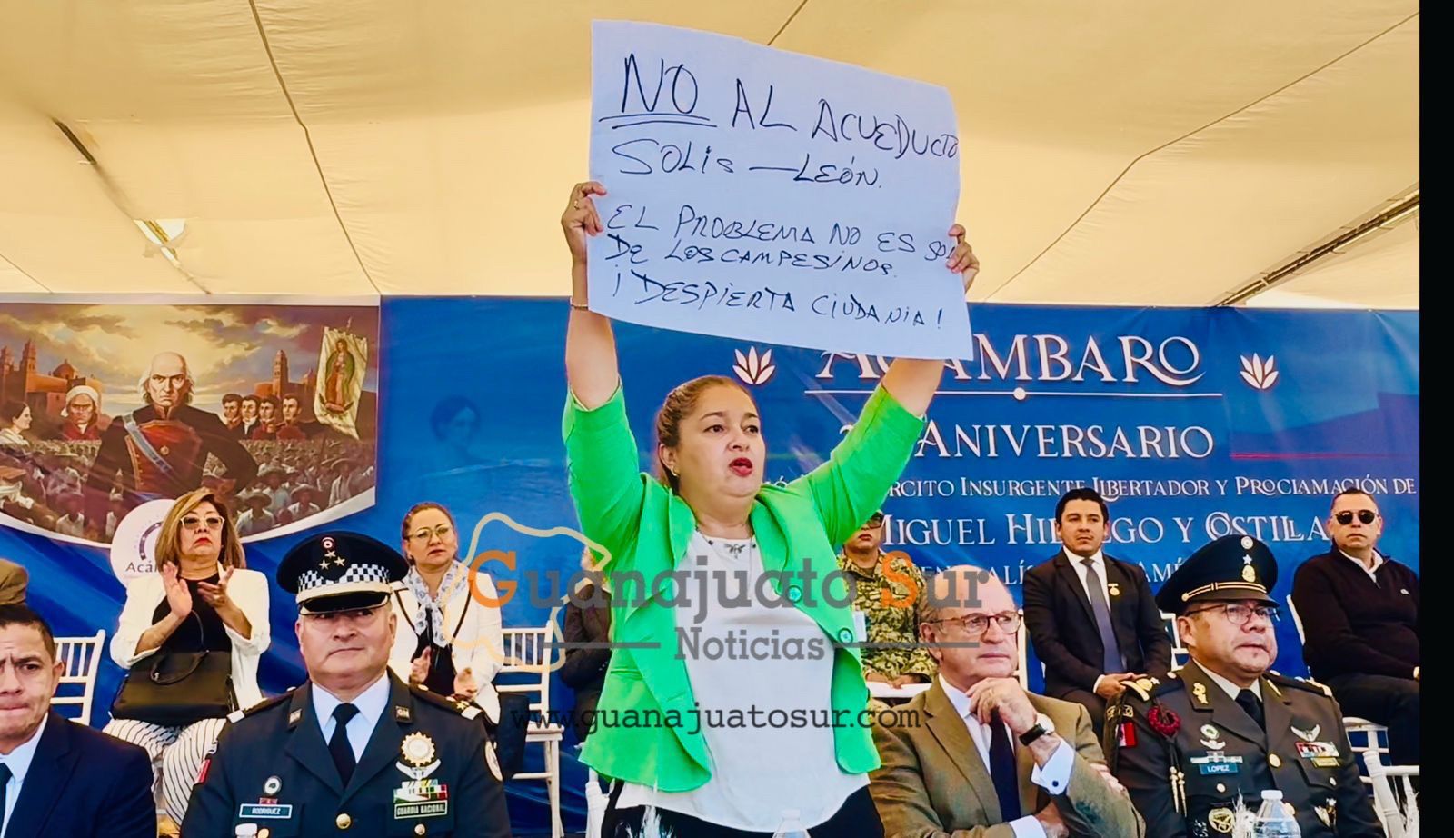 Durante el desfile cívico del 22 de octubre, en conmemoración del Benemérito de las Américas, la presidenta municipal mostró una cartulina con mensajes en defensa del agua de Acámbaro, gesto que generó gran atención pública y política.