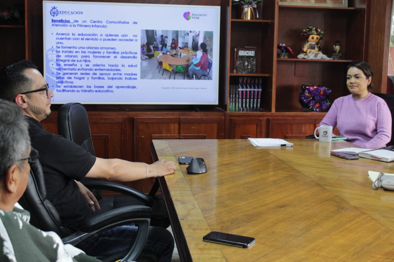 La presidenta municipal Cinthia Teniente sostuvo una reunión con el jefe de Seguridad Educativa de la Delegación Regional, Marco Soto Díaz y el jefe de la USAE, Javier González Pitayo con el propósito de revisar la propuesta para la expansión de la educación inicial no escolarizada en Villagrán.