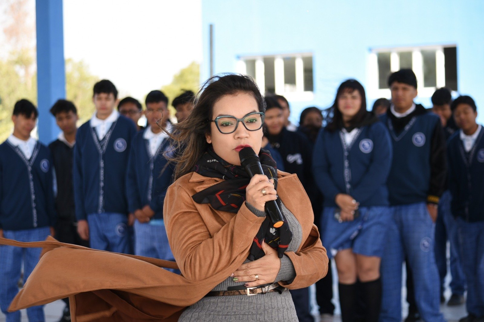 La presidenta municipal Cinthia Teniente Mendoza visitó esta mañana el plantel CECyTE Xonotli, donde convivió con alumnas, alumnos, docentes y personal administrativo, además de participar en los honores a la Bandera Nacional acompañada de la secretaria del Ayuntamiento Jazmín Carmona Cornejo, directoras y directores de distintas áreas municipales.