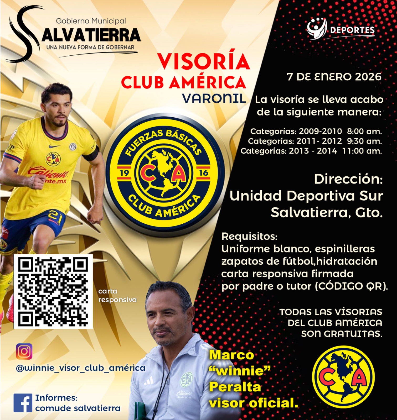 Los aspirantes deberán presentarse con uniforme blanco completo, espinilleras, zapatos de futbol y su propia hidratación; y como requisito indispensable, deberán entregar una carta responsiva firmada por el padre o tutor, la cual podrá descargarse de manera digital mediante el código QR disponible en las plataformas oficiales del Gobierno Municipal.