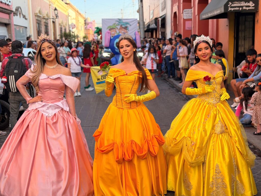El recorrido inició a las 5 de la tarde en la esquina de Miguel Hidalgo y 16 de Septiembre, encabezado por la reina, Valeria Danae I, acompañada de las princesas Alisson Altair y Heiry Michel, quienes portaron vistosos atuendos inspirados en personajes de Disney.