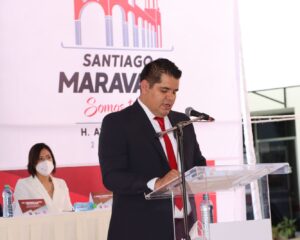 SANTIAGO MARAVATIO.- El Presidente Municipal de Santiago Maravatío Fernando Rosas Cardoso destacó obras y acciones en materia social, deportes, a la mujer, vivienda e infraestructura, así como embellecimiento al primer …